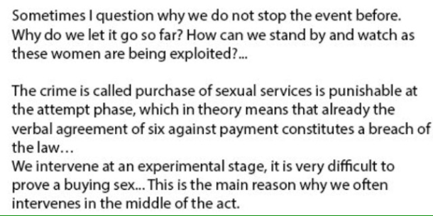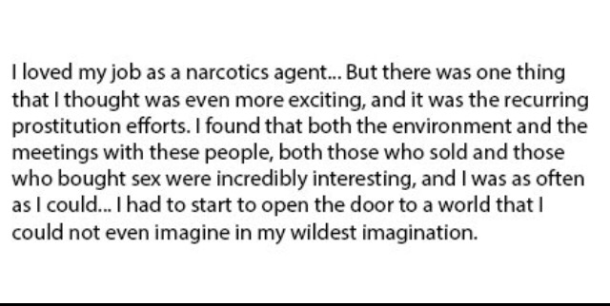 Well, great news, “Nordic model” advocates: you don’t have to take Amnesty’s word. Because Swedish super cop Simon Haggstrom – you’ll know him from his frequent visits to other countries to proselytise for the sex purchase ban – has now published his memoirs. Only in Swedish, alas, but that’s why God made Google Translate. Here are some of his views on how the law actually functions in practice. Let’s take them thematically, shall we?
