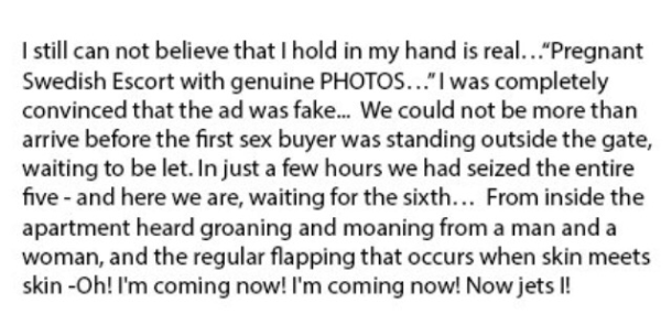 But even Amnesty might be surprised at the clumsy, cringeworthy porn that Haggstrom illustrates his accounts with – more surprised than Swedish sex workers seem to be, which is possibly telling in itself. Is it any wonder he’s such an advocate for the law? Without it, he’d have to get off with only his imagination again.